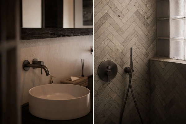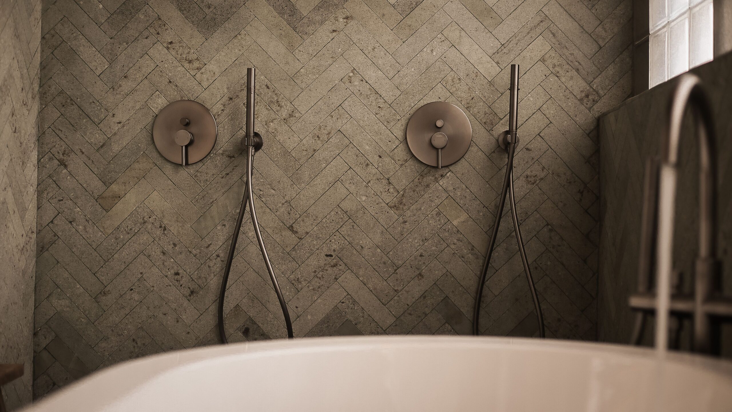 On the right, the PALOMA FCP 1827T concealed shower mixer blends neatly into the herringbone-tied wall, adding a classy touch to the space. Its high-quality materials and advanced finish make it long-lasting, and its ergonomic design makes it easy to use every day.