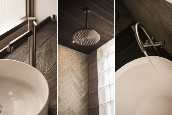 On the left, the PALOMA FCP 1843T basin mixer pairs beautifully with the calm white basin. In the center, the PALOMA FCP 1827T concealed shower mixer adds a neat and seamless touch. To the right, the PALOMA FCP 1805T floor-mounted bath/shower mixer combines style and practicality, completing the luxurious vibe of the space. These premium fixtures perfectly balance style, comfort, and functionality.