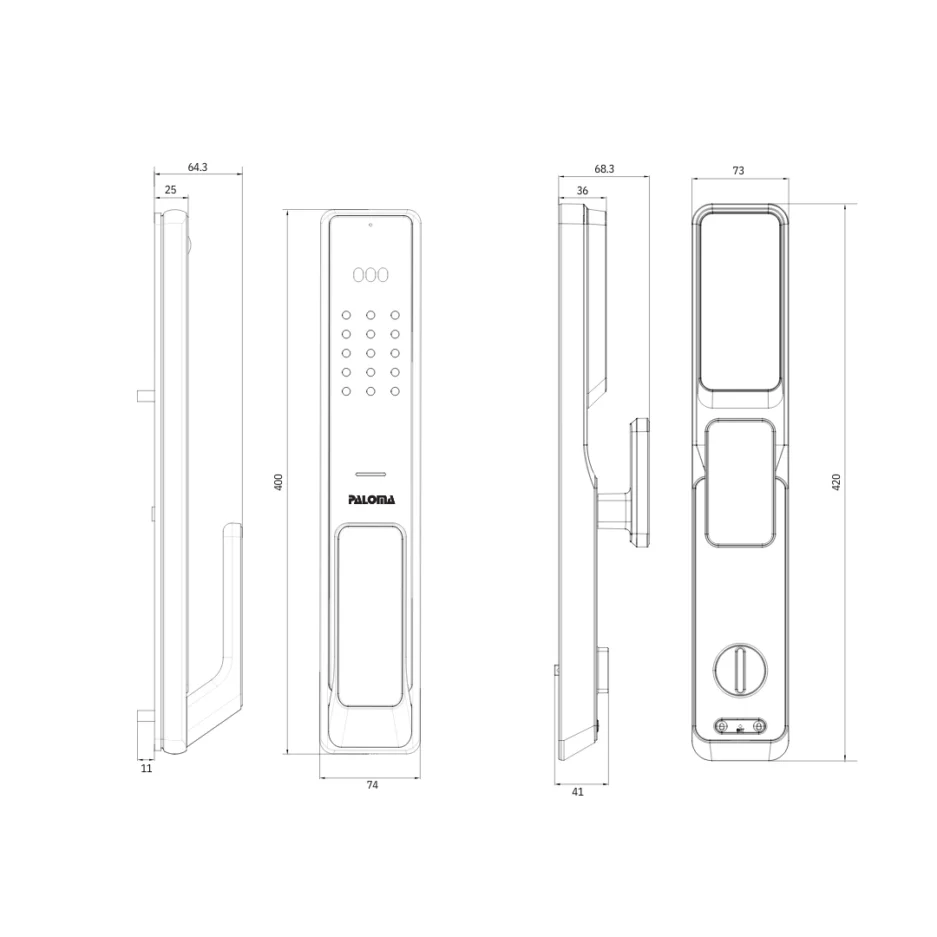 - Access methods: Mobile app, Face ID, palmprint recognition, hidden fingerprint sensor, PIN code, RFID MIFARE 1K 13.56 MHz card/tag/sticker, mechanical key.