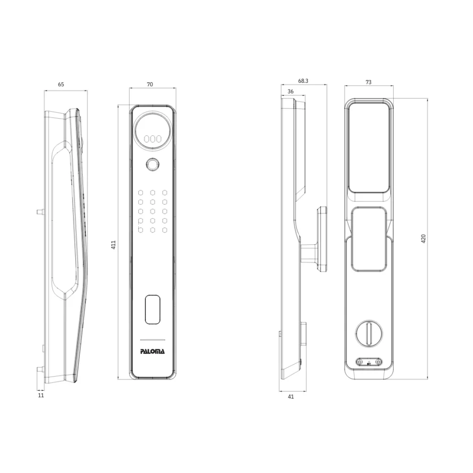 • Access methods: Mobile app, Face ID, palmprint recognition, fingerprint, PIN code, RFID MIFARE 1K 13.56 MHz card/tag/sticker, mechanical key.
