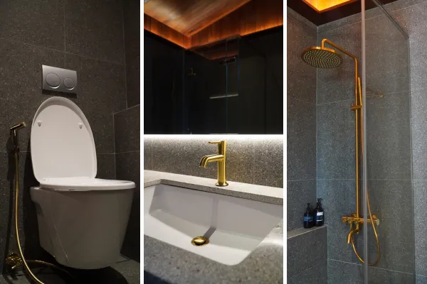 The bathroom features the Single Lever Monobloc Basin Mixer Aleena FCP 7831, a statement piece with its radiant porcelain handle and satin gold finish. It not only adds a touch of elegance but also ensures durability and longevity. The Toilet Shower 2-Spray Mode Luxury Gold, crafted from PowerABS material and SUS 304 stainless steel, offers a luxurious and refreshing shower experience.