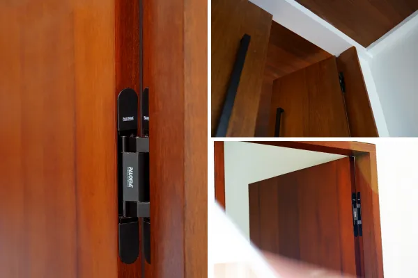 The Invisible Hinge Superalum  seamlessly blends into a modern, minimalist space. The clean lines of the satin black finish complement the warm wood tones of the door and the white walls, creating a sense of understated luxury. The hinge’s 3D adjustability ensures a perfect fit, enhancing the door’s sleek appearance.