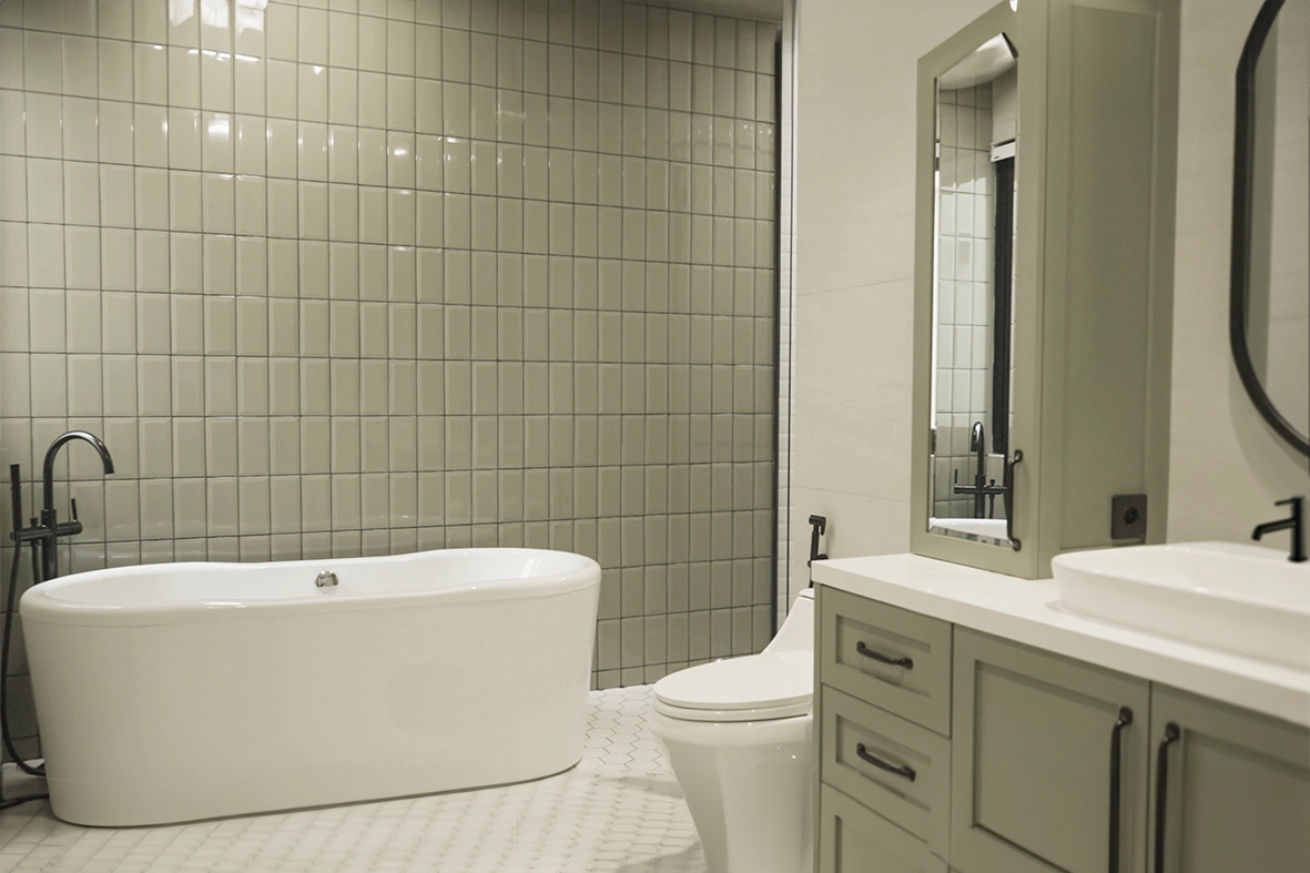 The bathroom exudes a calming atmosphere with its soft, neutral color palette. The walls are adorned with light green square tiles, creating a subtle backdrop that complements the overall minimalist aesthetic.