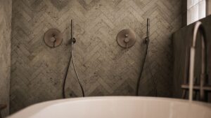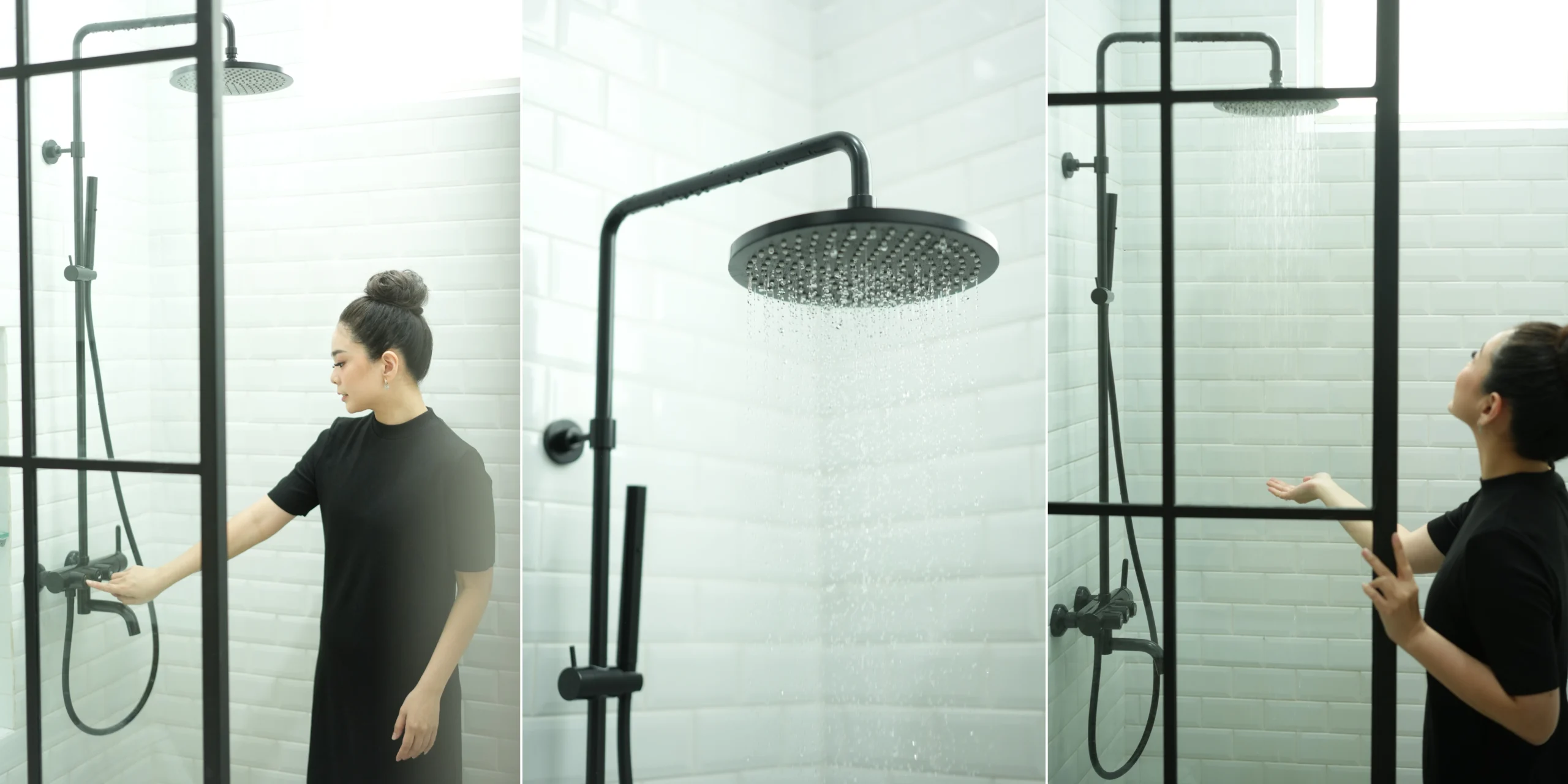 This modern bathroom features a sleek black shower system and a minimalist design. The white subway tiles and light gray flooring create a clean, airy atmosphere. A large glass panel encloses the shower area, adding a touch of luxury while keeping the space open and bright.