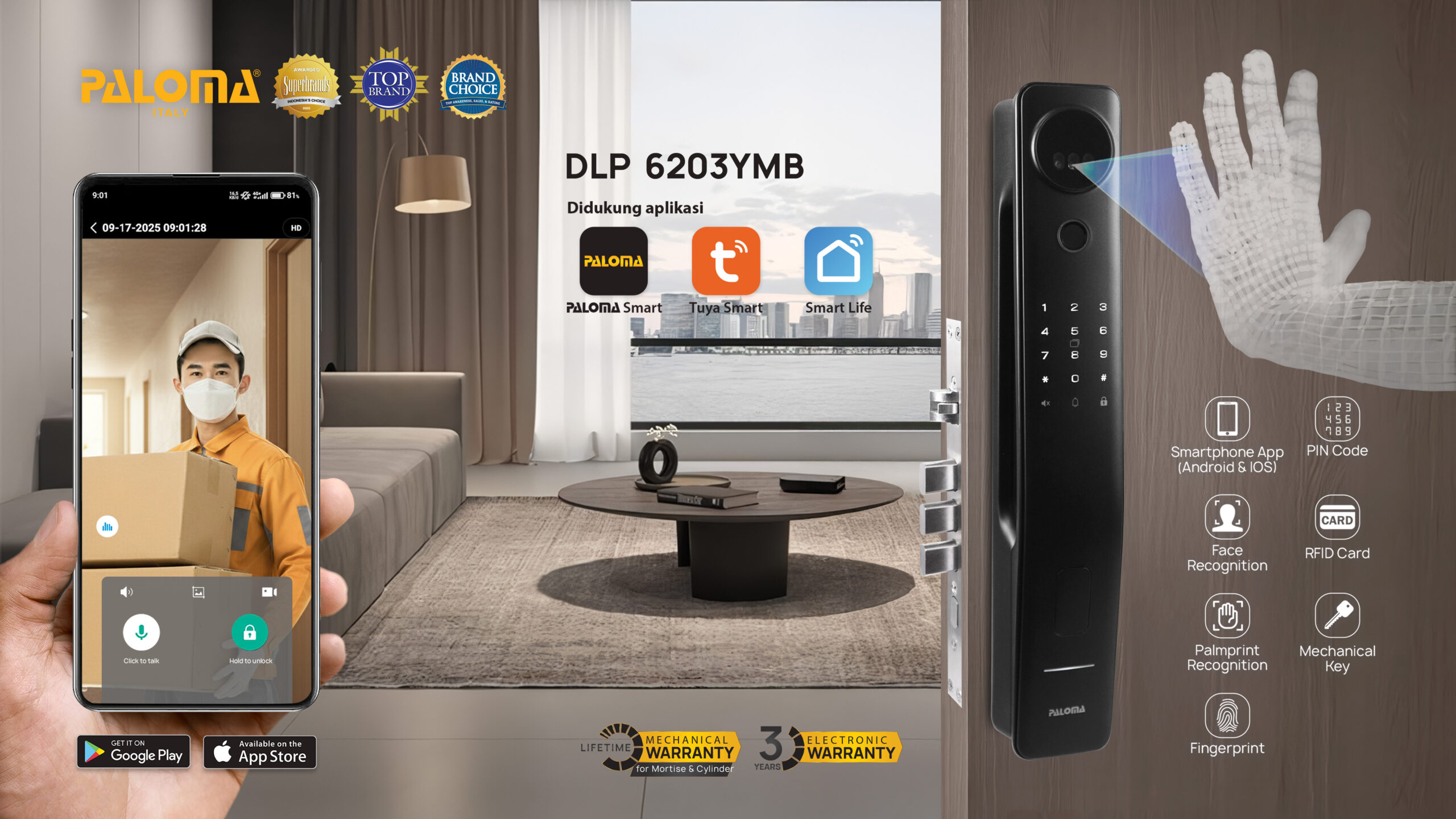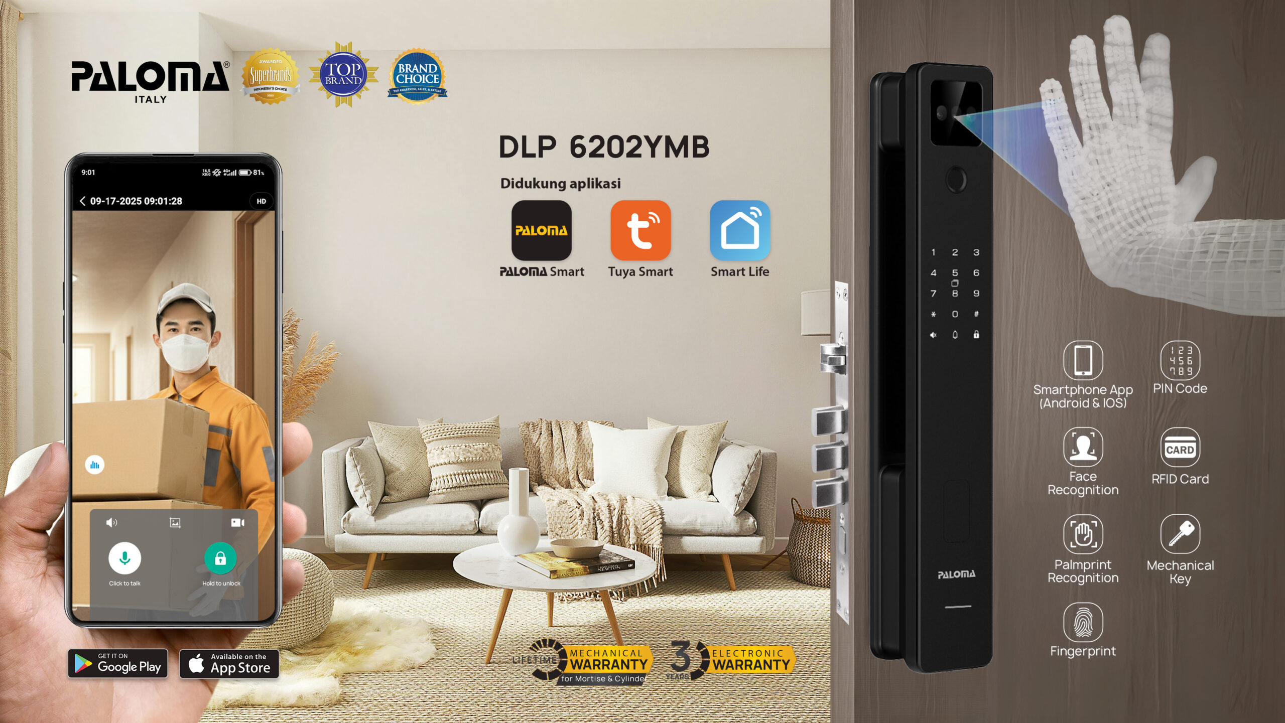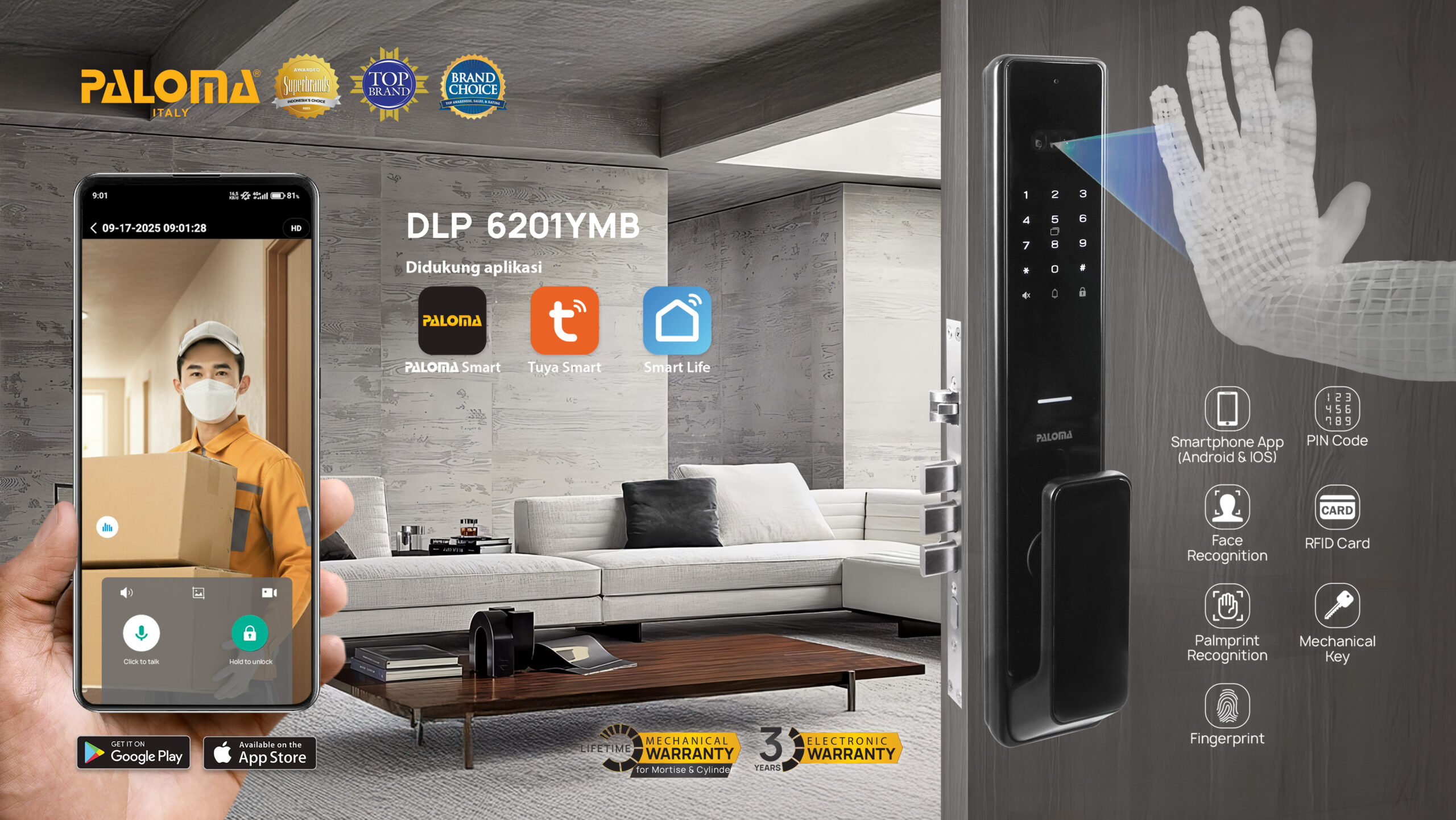 The PALOMA DLP 6200 Series makes home security simple and seamless. With palmprint recognition and 3D face recognition, unlocking your door becomes quicker, smarter, and more comfortable. A modern upgrade that combines strong security with a sleek look.